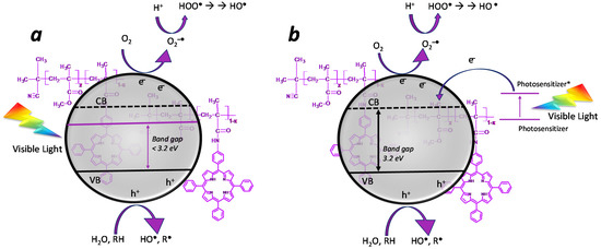 Simplified photocatalytic mechanisms in the presence of a photosensitizer. (a) The photosensitizer acts as a dopant, reducing the bandgap. (b) The photosensitizer acts as a light-harvesting system by injecting photo-excited electrons into the CB of TiO2.