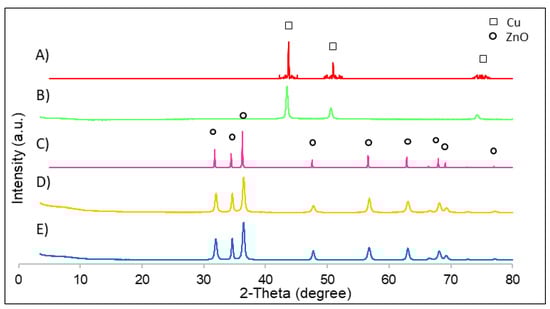XRD patterns of all catalysts: (A) Cu nanoparticle simulation; (B) Cu nanoparticles; (C) ZnO nanoparticle simulation; (D) ZnO nanoparticles with PVP; (E) ZnO nanoparticles.
