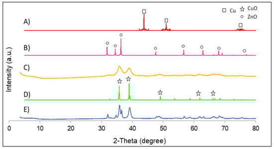 XRD patterns of all catalysts: (A) Cu nanoparticle simulation; (B) ZnO nanoparticle simulation; (C) Cu/ZnO nanoparticles; (D) CuO nanoparticle simulation; (E) CuO/ZnO nanoparticles.