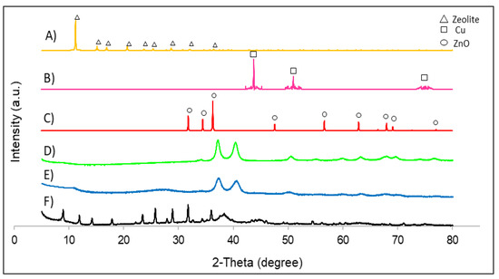 XRD patterns of all catalysts: (A) zeolite simulation; (B) Cu nanoparticle simulation; (C) ZnO nanoparticle simulation; (D) Cu/ZnO/polypyrrole nanotubes; (E) Cu/ZnO/activated carbon; (F) Cu/ZnO/zeolite.