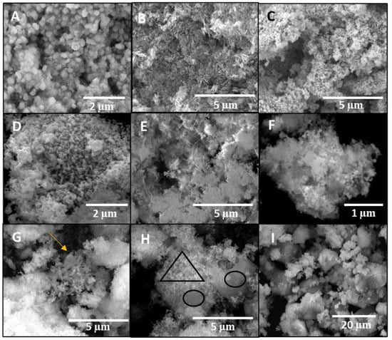 SEM images of the catalysts: (A) Cu nanoparticles; (B) ZnO nanoparticles; (C) ZnO nanoparticles with PVP; (D) CuO/ZnO bimetallic nanoparticles; (E) Cu/ZnO bimetallic nanoparticles with PVP; (F) Cu/ZnO bimetallic nanoparticles; (G) Cu/ZnO/polypyrrole nanotubes; (H) Cu/ZnO/activated carbon; (I) Cu/ZnO/zeolite. The arrow indicates the polypyrrole nanotubes, the triangle indicates the bimetallic nanoparticles, and the circumferences indicate the activated carbon.