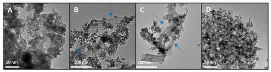 TEM images. (A) Cu/ZnO bimetallic nanoparticles with PVP; (B,C) Cu/ZnO/polypyrrole nanotubes; (D) Cu/ZnO/zeolite. The arrows indicate the polypyrrole nanotubes.