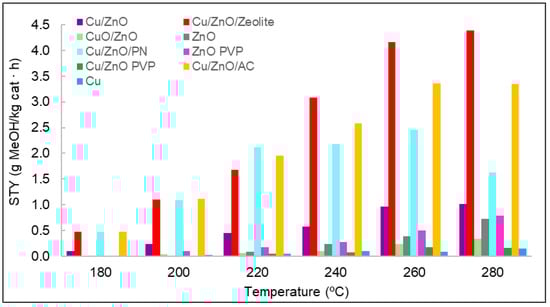 Finally, the STY values and selectivity towards methanol of all the catalysts at 260 °C and the temperature with the maximum STY values are plotted in Figure 10.