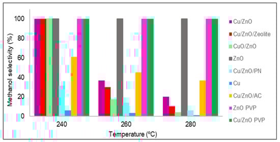 The methanol selectivity of all of the studied catalysts is shown in Figure 8. In all of the cases, from 180 to 220 °C, the methanol selectivity obtained was 100%, which means that no carbon monoxide was produced at these temperatures; thus, only the methanol selectivity values from 240 to 280 °C are plotted in Figure 8. Almost all catalysts had 100% methanol selectivity at 240 °C, but as the temperature increased, in general, all materials lost selectivity. This was due to the standard enthalpy of the reaction of methanol being negative; hence, it is an exothermic reaction that is favoured at low temperatures. However, in three catalysts, the amount of carbon monoxide obtained was zero for temperatures up to 280 °C. These catalysts were zinc oxide with and without PVP and Cu/ZnO with PVP. As stated in the literature [27], the catalytic activity and methanol selectivity can be correlated with the increase in Zn0 concentration. It was discovered that a zinc enrichment in the catalyst leads to greater activity and methanol selectivity due to two factors: improving the Cu and ZnO interactions that increase carbon dioxide hydrogenation and inhibiting the RWGS reaction, which produces carbon monoxide [34]. In the case of materials synthesised using PVP, this lack of carbon monoxide was possibly due to the poor distribution of zinc oxide and copper nanoparticles, which were also agglomerated. As expected, the active sites of copper were poisoned by formate, and only the active sites of zinc oxide were available.