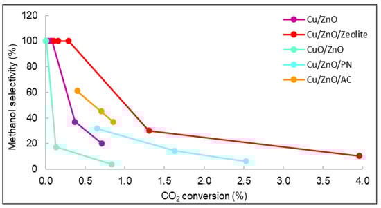 The relationships between the methanol selectivity and the CO2 conversion for some catalysts with good STY results are shown in Figure 9. The displayed values correspond to the methanol selectivity and conversion of carbon dioxide from 240 to 280 °C. As observed, the general behaviour was that as selectivity decreased, conversion and temperature increased. Figure 9 shows that the catalyst with the highest carbon dioxide conversion was Cu/ZnO/Zeolite, similarly to the STY results seen in Figure 7. The yield and conversion data were low compared with the literature. For example, using Cu/ZnO plates, the maximum CO2 conversion reported was 8% [35,36]. However, the operating conditions of pressure in these studies were higher (30 bar) than those of this work (15 bar). Even though many existing publications studied the catalytic properties of similar materials, it is very rare to find documents with studies operating at pressures lower than 20 bar [37,38].