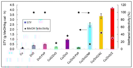 Representation of the STY and the methanol selectivity of all catalysts. The arrows indicate that methanol selectivity values can be read in the right vertical axis, and STY in the left vertical axis.