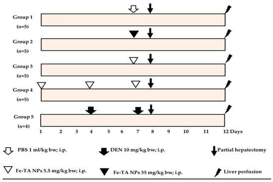 To determine the clastogenic activity of intraperitoneal Fe-TA NP administration, rat liver micronucleus assay was used in this study. Male Wistar rats (6-week-old, 180–190 g) were divided into five groups as is shown in Figure 1. Group 1 was established as a negative control receiving phosphate buffered saline, while groups 2 and 3 received a single dose of Fe-TA NPs at 55 and 5.5 mg/kg bw, respectively. Group 4 rats were injected with repeated doses of 5.5 mg/kg bw of Fe-TA NPs on days 1, 4 and 7 of the experiment. Group 5 served as a positive control receiving 10 mg/kg bw of diethylnitrosamine (DEN) on days 4 and 7 of the experiment. Twenty-four hours after the last injection, all rats were lightly anesthetized with isoflurane inhalation and underwent 2/3 partial hepatectomy. After the experiment was conducted for 4 days, rats were euthanized by overdose thiopental and their hepatocytes were isolated using the 2-step collagenase perfusion technique. Liver cells were stained with 4′,6-diamidino-2-phenylindole (DAPI) and analyzed under a fluorescent microscope. Micronucleated and mitotic hepatocytes were observed as 2000 hepatocytes/rat. The criteria for micronucleated hepatocyte scoring had been previously established by Chariyakornkul et al., 2019 [16].