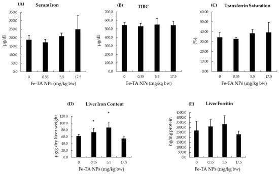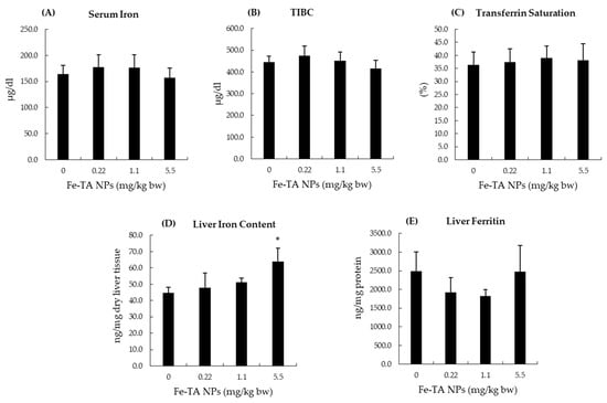Effect of 10-week experiment of Fe-TA NPs on serum and liver iron parameters in rats. (A): Serum iron, (B): TIBC (Total iron binding capacity), (C): Transferrin saturation, (D): Liver iron content, and (E) Liver ferritin. Data are expressed as Mean ± SD. * p < 0.05, significantly different when compared with a control group.