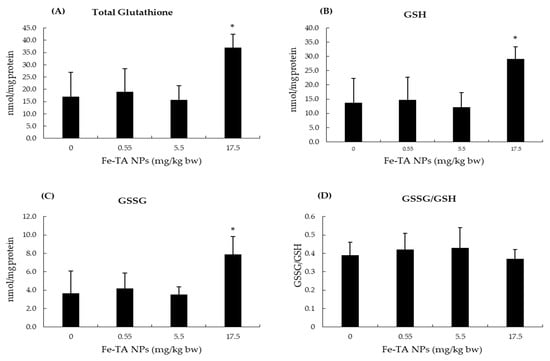 Effect of 10-week experiment of Fe-TA NPs on hepatic glutathione content in rats. (A): Total glutathione, (B): GSH (Reduced glutathione), (C): GSSG (Glutathione disulfide), and (D): GSSG/GSH (Glutathione disulfide to reduced glutathione ratio). Data are expressed as Mean ± SD. * p < 0.05, significantly different when compared with a control group.
