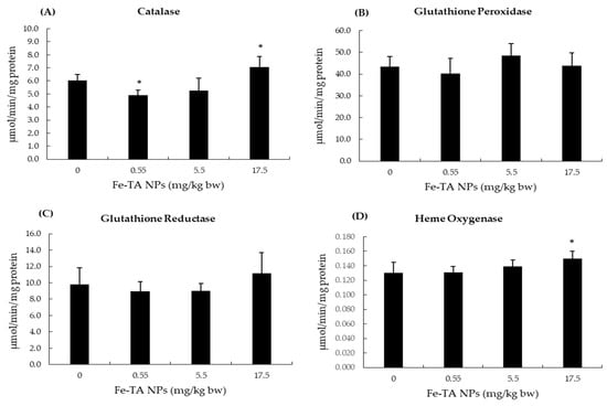 Effect of 10-week experiment of Fe-TA NPs on the activities of hepatic antioxidant enzymes in rats. (A): Catalase, (B): Glutathione peroxidase, (C): Glutathione reductase, and (D): Heme oxygenase. Data are expressed as Mean ± SD. * p < 0.05, significantly different when compared with a control group.