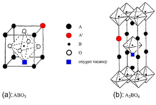 Ideal models of perovskite oxides with ABO3 and A2BO4 structure. The red dot represents the substitution of an A-site cation by a foreign one; the blue square represents the oxygen vacancies. The oxygen symbol is not shown in the A2BO4 structure for simplification. Reproduced with permission from Ref. [32]. Copyright 2014, ACS.