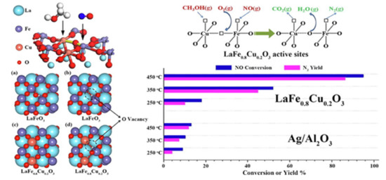 Wang et al. [74] investigated the SCR of NO by methanol (CH3OH) using a LaFe0.8Cu0.2O3 perovskite. The results were compared with those obtained on a Ag/Al2O3 reference catalyst, which is widely used in deNOx applications. The said perovskite catalyst was prepared by a conventional citric acid (CA) complexation method, while the Ag/Al2O3 sample was prepared by wet impregnation. Furthermore, a high-surface-area nanoscale perovskite structure was produced by adapting the reactive grinding method (RG), which is a synthesis approach that is commonly used in metallurgy. The SCR activity tests were carried out in a tubular fixed bed quartz microreactor with a GHSV = 63,000 h−1. The feed mixture comprised of 1000 ppm NO, 3000 ppm CH3OH, 8% O2, and He as balance gas. The catalyst physicochemical properties were explored by carrying out NOads + O2ads TPD, XRD, H2-TPR, H2 physisorption, and isotopic exchange experiments. The LaFe0.8Cu0.2O3 sample modified using the RG method outperformed the other tested catalysts in terms of both NO conversion and N2 yield (Figure 2). Specifically, NO conversion of LaFe0.8Cu0.2O3/(RG) was almost 95% at 450 °C while N2 yield was approximately 93% as shown in Figure 2 and Figure 3; the latter figure also shows the perovskite sites on which the CH3OH, O2, and NO reactants are activated. The increased catalytic performance of LaFe0.8Cu0.2O3/RG was attributed to the higher surface area and subsequently to the increased number of surface-active sites available (Figure 3). Furthermore, a promoting effect regarding the formation of surface bounded O2 species was observed, probably due to the increased number of active redox sites resulting from the decrease in crystal domain size. The second-best catalyst was LaFe0.8Cu0.2O3/CA whereas the Cu-free LaFeO3/CA catalyst was third in activity order, offering maximum conversions that slightly exceeded 80% at the highest temperature (600 °C) investigated (Figure 2). The conventional Ag/Al2O3 catalyst performed poorly (close to inactive) for the entire temperature range under investigation (Figure 2).