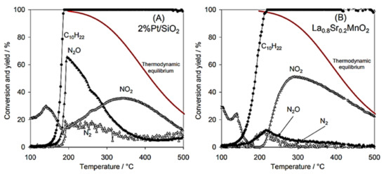 Reactant (C10H22) conversion and product (N2, N2O, NO2) yields for Pt/SiO2 (A) and La0.8Sr0.2MnO3 (B) catalysts (feed gas: 400 ppm NO, 240 ppm C10H22, 1.5 vol% H2O, and 9 vol% O2). Reproduced with permission from Ref. [77]. Copyright 2014, Elsevier.
