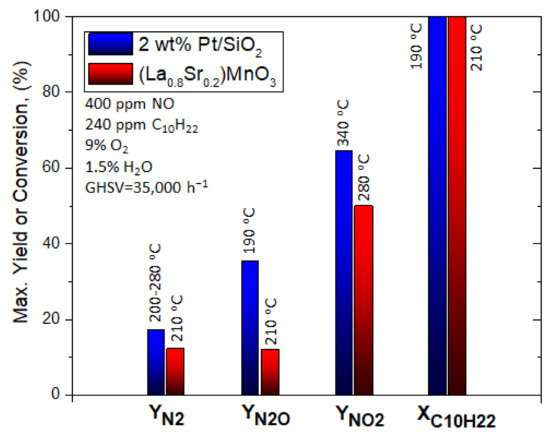 A closer look at the behavior of Pt/SiO2 catalyst under SCR conditions (Figure 4A) shows that both reduction of NO to N2O and C10H22 oxidation initiated at the same temperature, while the maximum N2O yield (i.e., 65%) was obtained at 195 °C when the conversion of C10H22 was 100%. The amount of N2 produced was lower compared to that of N2O, both reaching maximum yields of 18% and 65%, respectively, at ~200 °C. Exceeding 200 °C, N2 and N2O yields dropped, though, NO conversion to NO2 showed an increasing trend and reached a maximum of 37% at 370 °C. The maximum NO2 yield was lower and shifted to higher temperatures when NO oxidation took place in the absence of C10H22. In addition, the NO2 yield was below the thermodynamic equilibrium curve even at the highest temperature of 500 °C reached (Figure 4A). The La0.8Sr0.2MnO3 catalyst showed a relatively different catalytic behavior than Pt/SiO2. A less competitive relationship between NO and C10H22 was observed for temperatures lower than 200 °C, and thereby NO conversion was not favored toward C10H22 oxidation. The maximum values of N2 and N2O yields (almost 13%) at 210 °C were obtained when the conversion of C10H22 was 100%. NO2 production started at 200 °C and reached a maximum value of 50% at 290 °C. Regarding the maximum yield of NO2, it was lower compared to that of the NO oxidation experiment in the absence of C10H22, however, it was recorded at almost the same temperature ca. 285–290 °C. The fact that the NO/C10H22 system exhibited lower maximum NO2 yield was ascribed to the parallel oxidation reactions of C10H22 and NO over different redox systems (Mn3+/Mn2+ and/or Mn4+/Mn3+). The said redox systems were considered as the active species participating in the Mars–van Krevelen mechanism, which is a widely accepted mechanism for hydrocarbons oxidation using mixed oxide catalysts [78,79]. The perovskite (La0.8Sr0.2MnO3 catalyst) showed better NO → NO2 oxidation activity and thus allowed a closer approximation of the thermodynamic equilibrium of this reaction compared to the Pt-based catalyst (Figure 4). Finally, the authors concluded that the La0.8Sr0.2MnO3 perovskite could be a promising alternative, noble metal-free catalyst for NOx emission control (Figure 5). Table 1 synopsizes the main literature studies analyzed in Section 2.1.