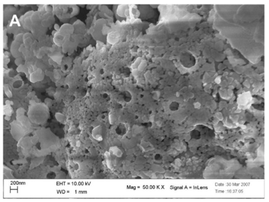 De Lima et al. [99] prepared LaFe1−xCoxO3 perovskites, namely LaFeO3 and LaFe0.6Co0.4O3, synthesized either conventionally (by the citrate method) or using a nanocasting method; the latter leads to materials constituted by more than 97 wt% of perovskite phase and by agglomerates smaller than 100 nm constituted by crystallites of about 6 nm (Figure 20). As a result, the nanocast perovskites had about 10 times larger specific surface areas compared to the conventional perovskites (e.g., 49.3 and 30.5 vs. 5.6 and 3.6 m2/g for the nanocast and conventional LaFeO3 and LaFe0.6Co0.4O3 perovskites, respectively). These materials were comparatively evaluated in the reduction of NO by CO. Figure 21 shows the results of this comparison. Obviously, the nanocast perovskites are significantly more active than their conventional counterparts, and as the authors conclude this is mainly due to the higher specific surface area of the former and the consequent higher number of accessible active sites exposed to the reactants.
