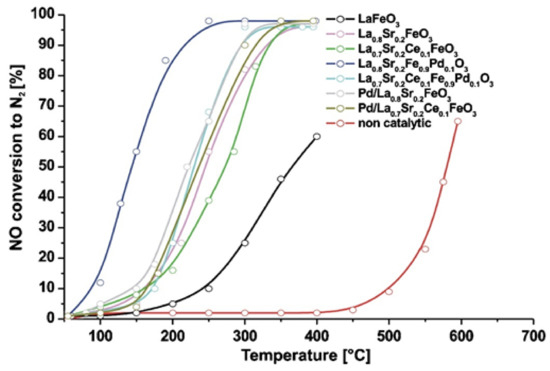 Luo et al. [80] prepared, via a sol–gel method, a series of LaNi1−xFexO3 (x = 0.0, 0.2, 0.4, 0.7, 1.0) perovskites to study the SCR of NOx by H2 at temperatures between 200 and 400 °C in a fixed bed reactor (500 mg catalyst) using a 500 ppm NO, 3.5 vol% H2, 8 vol% O2 (balance N2) gas feed composition with a total flow rate of 600 mL min−1. Sulfur-aging and regeneration treatments were also involved in their study. They found that Fe-doping of the base LaNiO3 perovskite results in a better NOx removal (Figure 6), and high structural stability.