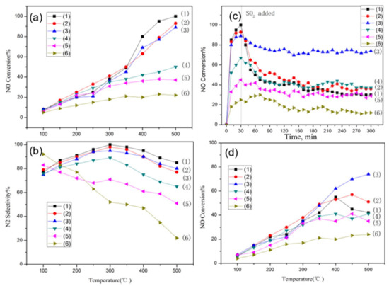 NO conversion over LaxCe1−xFeO3 perovskites during the NO reduction by CO: NO conversion versus temperature from 100 to 500 °C (a), and corresponding N2-selectivities (b) using 400 ppm NO/500 ppm CO/He balance at 1 bar and GHSV of 24,000 h−1; NO conversion versus time of LaxCe1−xFeO3 catalysts at 500 °C with 100 ppm SO2 in the feed (c); NO conversion versus temperature of LaxCe1−xFeO3 catalysts in CO + NO reaction with the addition of 100 ppm SO2, 3% O2 and 3 vol.% H2O in the feed (d). (1): LaFeO3, (2): La0.8Ce0.2FeO3, (3): La0.6Ce0.4FeO3, (4): La0.4Ce0.6FeO3, (5): La0.2Ce0.8FeO3, and (6): CeO2. Reproduced with permission from Ref. [90]. Copyright 2016, Elsevier.