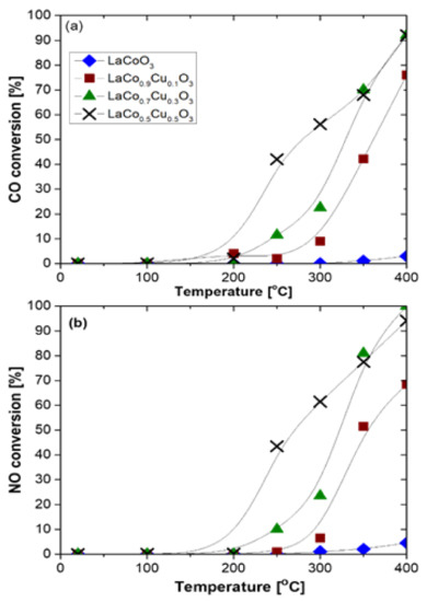 CO (a) and NO (b) conversion as a function of temperature on LaCo0.5Cu0.5O3, LaCo0.7Cu0.3O3, LaCo0.9Cu0.1O3, and LaCoO3 perovskites. Conditions: 4% NO/4% CO/balance He at 1 bar; WGHSV = 150,000 mL∙g−1∙h−1. Reproduced with permission from Ref. [59]. Copyright 2016, Elsevier.