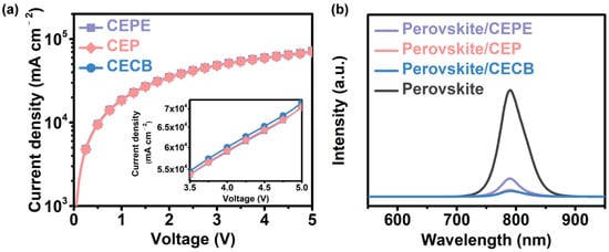 Later on, we further recorded steady-state PL spectra of different fullerene films deposited on the perovskite films. The PL quenching situation showing that all three fullerene compounds can be good ETMs for the PSCs is shown in Figure 2b. In particular, the CECB exhibited the best PL quenching ability, followed by CEP and then CEPE, indicating the superiority of the CECB, which was consistent with the electron mobility. We attributed these differences in photoelectric properties to the different fullerene structures with respect to the lengths and steric hindrance of side chains on the convex of fullerene cages [,].