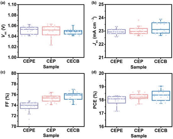 To further compare the photovoltaic parameters, we fabricated 20 devices for each fullerene ETM. The statistic diagrams of Voc, Jsc, fill factor (FF), and PCE are shown in Figure 4 and Table S3. We considered that the almost same LUMO energy level of these three fullerene ETMs led to a similar Voc value of the device, as shown in Figure 4a. As for Jsc values, the CECB film possessed the highest electron mobility, resulting in the largest Jsc value contributed by the excellent electron transporting ability [].