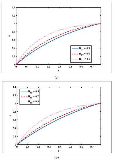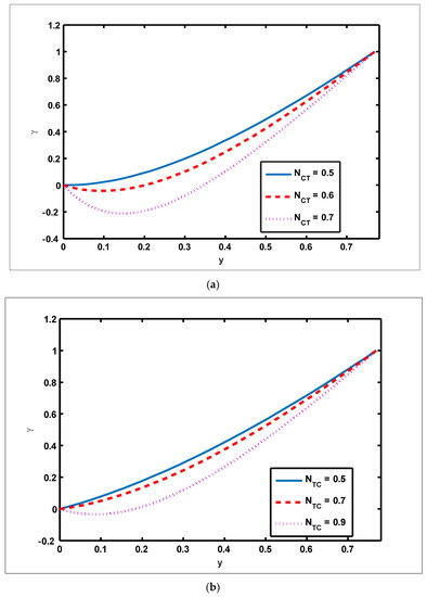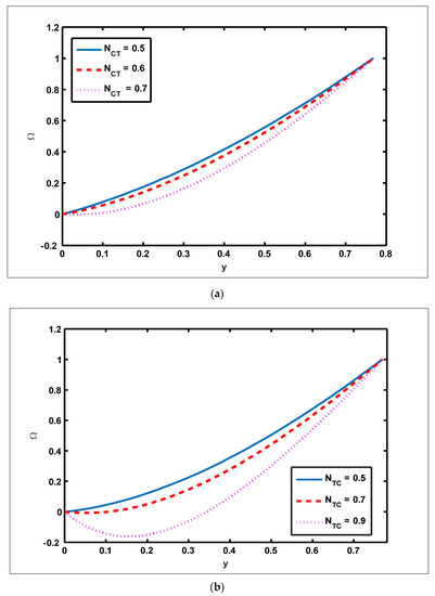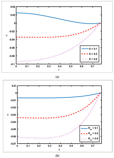 - The magnitude of the velocity profile enhances due to increasing behavior of and when but the opposite behavior is sustained when