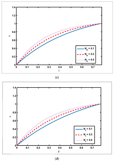 Temperature profile for Soret, Dufour, Brownian motion, and thermophoresis parameters. Values of other physical parameters are (a) (b) (c) (d) .