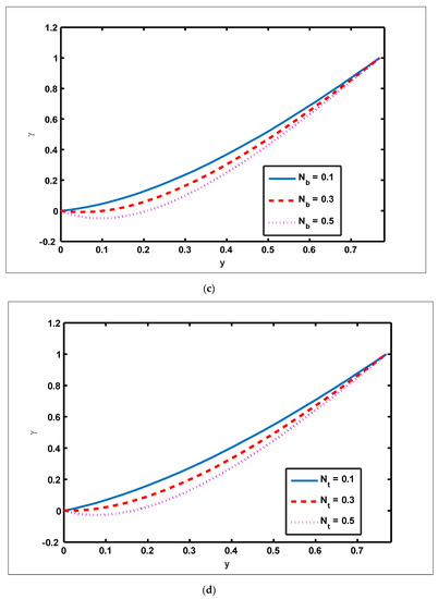 Profile of nanoparticle fraction for Soret, Dufour, thermophoresis, and Brownian motion parameters. Values of other physical parameters are (a) (b) (c) (d) .