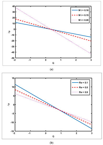Effect of Weissenberg number, Reynolds number, slip parameter, and Grashof number of nanoparticles on pressure rise. (a) .