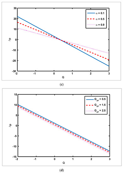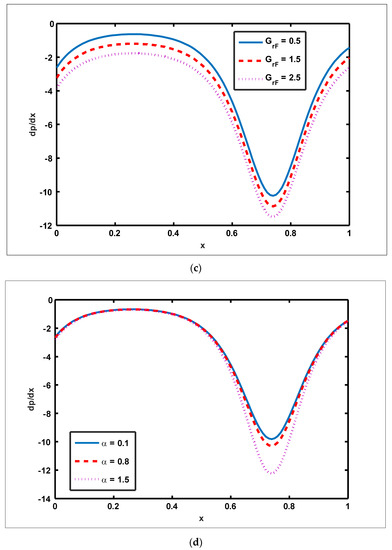 To highlight the outcomes of temperature on Soret Dufour , Brownian motion and thermophoresis parameters, Figure 1a–d is plotted. It is shown in Figure 1a–d that increases in the Soret, Dufour, Brownian motion, and thermophoresis parameters result in a rise in the temperature profile. It is because temperature has a direct link with the constraints of Soret, Dufour, Brownian motion, and thermophoresis. To observe the impact of concentration on Soret Dufour , Brownian motion and thermophoresis constraints, Figure 2a–d is drawn. It is witnessed in Figure 2a–d that the concentration profile tends to fall as the values of , , and parameters increase. This is because spontaneous motion interacts with micro-mixing and haphazard collision behavior of solid nanoparticles, dispersing the solid nanoparticles and lowering the solute concentration. Figure 3a–d depicts nanoparticle reactions for greater values of , , and . By growing the values of , the nanoparticle drops (see Figure 3a–c). However, the adverse effect is noted for the case of Brownian motion . Here, nanoparticle fraction boosts due to enhancing values of (see Figure 3d). The impact of and on pressure rise is demonstrated in Figure 4a–d. It is witnessed in Figure 4a that enhancing causes pressure rise to increase in the peristaltic (), retrograde (), and free () pumping zones, but increasing causes pressure rise to increase in the augmented () pumping area. However, the adverse effect is noted for the case of and It is noted that increasing Re and α causes pressure rise to diminish in the peristaltic (), retrograde (), and free () pumping zones, whereas increasing and causes pressure rise to surge in the augmented () pumping zone (see Figure 4b–c). Impact of on pressure rise is explained in Figure 4d. It is found in Figure 4d that pressure rise tends to reduce in all peristaltic zones. The significance of and on the pressure gradient is demonstrated in Figure 5a–d. It is represented in Figure 5a–d that the pressure gradient is minimal in a wider section of the channel, between and , depicting that flow can pass easily without inducing a larger pressure gradient. The pressure gradient is significant in the narrow section of the channel , indicating that a higher pressure gradient is crucial to sustain the flux. Furthermore, as and grow, the magnitude of the pressure gradient increases. To illustrate the impact of flow quantities on , and Figure 6a–d is plotted. It is observed in Figure 6a–d that the magnitude value of the velocity profile increases due to increasing behavior of and when but the opposite behavior is sustained when In this region, the magnitude value of velocity decreases by increasing and It is noted in Figure 6c that totally opposite effects are sustained by the velocity profiles with an increase in Here, the magnitude of velocity lessens due to the escalating behavior of when but velocity increases due to a reduction in the drag force when It is illustrated in Figure 6d that velocity enhances when volume flow rate increases. To study the impact of the magnetic force function, Figure 7a,b is drawn. It is seen from these figures that the magnitude of magnetic force function tends to grow by rising and values.