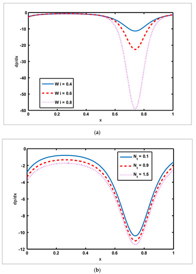 Effect of Weissenberg number, thermophoresis, Grashof number of nanoparticles, and slip parameter on pressure gradient. Values of other physical parameters are (a) . (b) .