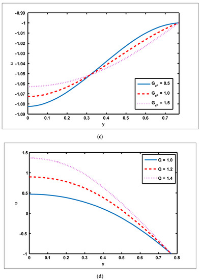 Velocity profile for Weissenberg number, solutal Grashof number, Grashof number of nanoparticles, and volume flow rate. Values of other physical parameters are (a) . (b) (d) .