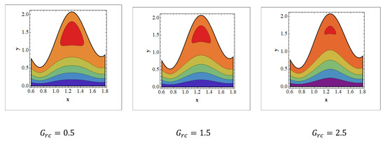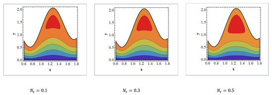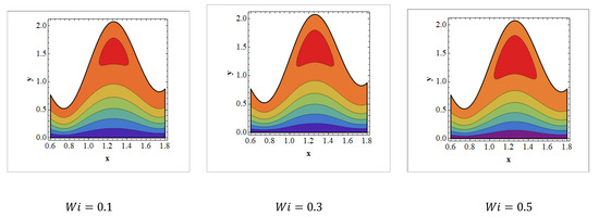 Trapping is an infrequent occurrence in peristaltic progressed flows. It is stimulated by the internal movement of a fluid mass enclosed by peristaltic wave streamlines. With peristaltic movement at high flow rates and large occlusions, streamlines capture the fluid mass bolus and carry it forward. The aspects of streamlines are depicted in Figure 8, Figure 9 and Figure 10 for various values of and . It should be noticed in Figure 8 and Figure 9 that when the value of and grows, trapped bolus size tends to grow. The opposite behavior is observed Figure 10. It is noted in Figure 10 that when increases, the size of the trapped bolus decreases.