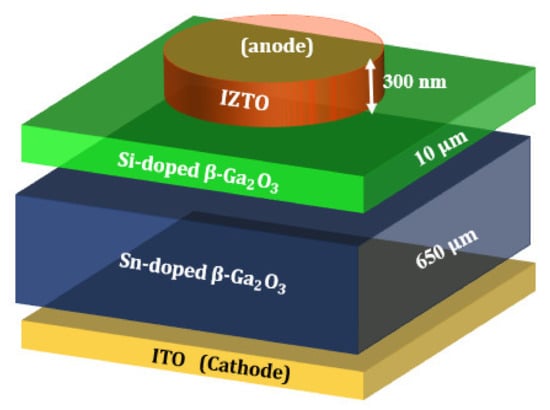 According to several publications [,,], ITO forms an Ohmic contact with β-. In this simulation, an ideal ohmic contact was considered for ITO/β-Ga2O3 interface. A low ITO/β-Ga2O3 barrier was achieved when highly doped β- substrate was used.