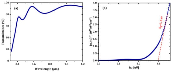 where is the absorption coefficient, C is a constant, h is Planck’s constant, and is the frequency of the incident light. By plotting (α ()2 versus , the optical bandgap of the IZTO thin film was determined to be 3.5 eV, as shown in Figure 2b. This value agrees with the published value []. The refractive index has a significant importance in the design of optical devices. It reflects the crystallinity and optical quality of thin films. The extinction coefficient () and the refractive index () of IZTO thin film are calculated by []: