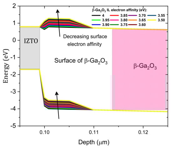 Next, an IL (10 nm thickness) between Si-doped β-Ga2O3 and IZTO was considered for modeling the effect IZTO/β-Ga2O3 conduction band offset on the SBD performance. The effects of the IL electron affinity on the SBD J–V characteristics were studied, and these effects are shown in Figure 5. Experimentally, the IL electron affinity is related to the chemical composition of the surface [] and surface polarization [] as well as external effects, such as argon (Ar) bombardment, plasma, etc. The current density decreases with decreasing IL electron affinity of Si-doped β-Ga2O3, i.e., from 4 to 3.5 e V [], but the IL electron affinity has a more pronounced effect in the high voltage domain. This is due to the increase in the height of the Schottky barrier () with decreasing IL electron affinity according to the Schottky–Mott rule and the increase in the series resistance []. As presented in Figure 6, with decreasing IL electron affinity, the barrier between IZTO and β-Ga2O3 increases. An agreement between measurement and simulation occurs for voltages higher than 1 V for a 3.556 eV IL electron affinity. However, a disagreement between simulation and measurement was noticed in the low-voltage domain, and this is related to the effect of the IZTO workfunction and the concentrations of the interfacial traps, which are addressed in the next two subsections.