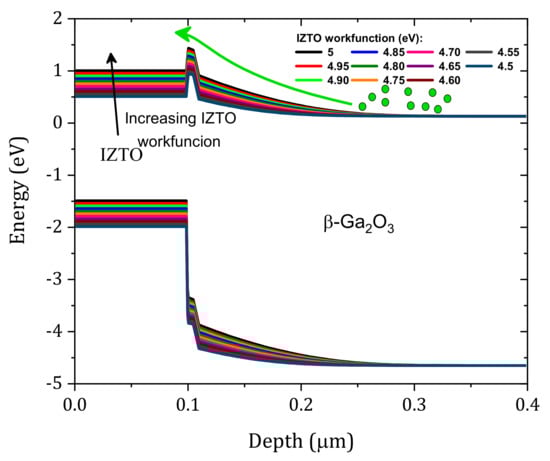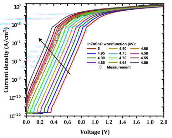 In addition to the IL electron affinity, the IZTO workfunction will have an effect. As shown in Figure 7, when the IZTO workfunction decreases from 5 to 4.5 eV [,] the current density increases. This increase in the current density is related to the decrease in as presented in Figure 8; the formed barrier between IZTO and Si-doped β-Ga2O3 increased. The best agreement between simulation and measurement was achieved for . The small deviation from measurement, i.e., in the range of 0.4–0.8 V, was due to the parameters of the traps that are considered (Table 2), which may not be accurate. It also may be related to the effect of the different compositions of the materials (In, Zn, and Sn) [].