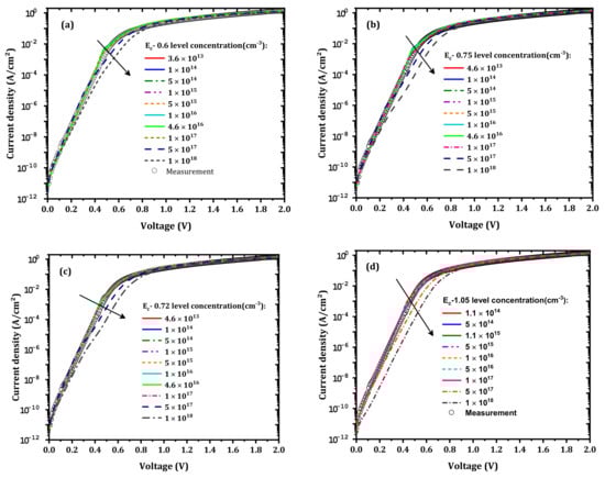 For the simulation, we considered thermionic emission, Shockley–Read–Hall, Auger recombination, and image force lowering models. The physical parameters of different layers and related traps are presented in Table 1 and Table 2, respectively.