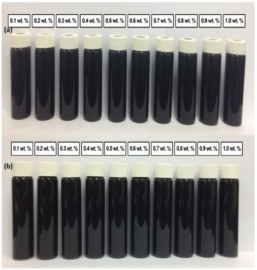 Figure 6a,b shows the condition of various weight percentages of the commercial MWCNTs based nanofluid with a surfactant of PVP. Adding surfactant will adjust the hydrophobicity nature of MWCNTs into a hydrophilic surface that might prevent agglomeration. As can be seen, the dispersion stability improved slightly compared to nanofluids without PVP with similar settling sedimentation behaviour. Nanofluids contain a low concentration of MWCNTs show stability with no sedimentation. However, rapidly dispersed sedimentation occurred in the samples at 0.4 wt.%, 0.5 wt.%, 0.6 wt.% 0.7 wt.%, 0.9 wt.% and 1.0 wt.% after 0.5 h. This sedimentation continuously occurred at 0.2 wt.% of commercial MWCNTs based nanofluid after 100 h. The PVP is added to reduce the surface tension between solid and liquid, thus improving the dispersing of particles and preventing the particles from settling. However, in this experimentation, particle coagulation and sedimentation occurred. This result can be due to the weight percentage of PVP, which is a 10% concentration of carbon particle, which is not suitable for a certain weight percentage of MWCNTs and made the nanofluids unstable. The duration of homogenization and sonication process that is too long also can cause sedimentation to occur []. However, no sedimentation was observed for 0.1 wt.% and 0.3 wt.% of commercial MWCNTs based nanofluids after 100 h. On the other hand, the introduction of nonionic surfactant PVP in the formulation has less influence on the stability of the as-prepared nanofluids.
