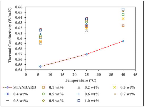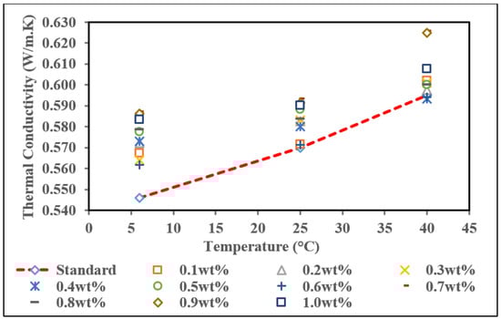 The result of thermal conductivity of commercial MWCNTs nanofluid without PVP at three different temperatures is represented in Figure 8 to identify the patterns of the heat effects on each sample. The thermal conductivity for pure base fluid (standard) was 0.546 W/m·K, 0.570 W/m·K, and 0.595 W/m·K at 6 °C, 25 °C, and 40 °C, respectively, and presented in a straight line in Figure 8. These thermal conductivity values are standard values for comparison with the thermal conductivity of commercial MWCNTs based nanofluid without PVP. Based on the graph, the trend for this nanofluid is increasing thermal conductivity with increasing temperature. The thermal conductivity values are above the pure base fluid (standard) as the temperature increases from 6 °C to 25 °C. However, at a temperature of 40 °C, few samples record thermal conductivity lower than the standard value, which is at weight concentrations of 0.3 wt.% and 0.4 wt.%. In comparison, the other samples continuously increase as the temperature increases to 40 °C.