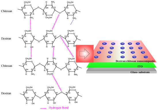 Biopolymers have been regarded as one of the most promising resources for the fabrication of hybrid biomaterials, on account of their biocompatibility, biodegradability, ease of solubility, and hydrophilicity, coupled with various chemical functionalities [1]. As an attractive, versatile, and inexpensive combinational method, polymer blending can create novel bio-nanocomposites with tailored properties for biomemory applications and without external crosslinkers that can hamper biological activity [2,3]. Biopolymers, such as starch [4], cellulose [5], chitosan [6], and dextran [7], are commonly utilized in bio-nanocomposites. Notably, biodegradable films consisting of biopolymer materials have been proposed for application in drug-delivery systems, biomedicine, hydrogels, water treatment, food packaging, and membranes [8,9]. Natural polysaccharides such as chitosan and dextran are widely employed for biomedical applications [10]. Different methods have been used to fabricate dextran/chitosan-based composites as drug-loading and -delivery systems with therapeutic potential [11,12]. The good biocompatibility and functionality of both of these polymers, together with their biodegradability and nontoxic degradation byproducts, displays a great potential for incorporation with various active agents, including drugs and biologics.