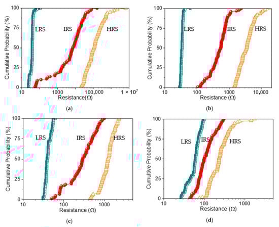 The switching cyclability (endurance) analysis of the dextran-based biomemristor (Figure 8) clearly presented the multi-bit data storage feature with a distinguishable number of levels and then plotted this as cumulative analyses in order to better understand the resistance distribution (Figure 9). The distribution of the resistance in HRS, IRS, and LRS (RHRS, RIRS, and RLRS) suggested that RLRS was tightly distributed in the measured resistance, while RHRS and RIRS held a loose distribution. These RS cycles were maintained even after cycle-to-cycle scanning (up to 100 times). Most strikingly, the variation of the mean resistance in HRS, IRS, and LRS according to the distinct weight ratio of chitosan and dextran (Table 4) revealed that the average resistance ratio RHRS:RIRS:RLRS for ITO/B1/Ni was roughly 105:104:1. It is important to note that the device with the B2 system exhibited a lower RHRS:RIRS:RLRS ratio (103:102:1). The 9.1 wt% dextran-based device displayed the lowest resistance ratio (5:2:1) compared with that of the 16.7 wt% dextran-based biomemristor (30:10:1). With the incremental increase in the content of dextran from 9.1 wt% to 50 wt%, a significantly enhanced trend was observed in the RHRS:RIRS:RLRS ratio for the dextran–chitosan devices, as the multi-bit memory behavior was available. The indication was that the introduction of dextran played a critical role in enhancing the RHRS:RIRS:RLRS of the devices, particularly by reducing the current level in RHRS and RIRS while increasing the current level in RLRS.