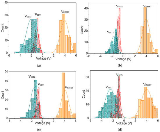 Histogram curves of VSET1, VSET2, and VRESET for (a) ITO/B1/Ni, (b) ITO/B2/Ni, (c) ITO/B3/Ni, and (d) ITO/B4/Ni during repeated resistive switching.