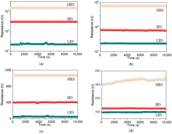 Retention tests conducted at RHRS, RIRS, and RLRS of (a) ITO/B1/Ni, (b) ITO/B2/Ni, (c) ITO/B3/Ni, and (d) ITO/B4/Ni without evident changes for over 104 s.