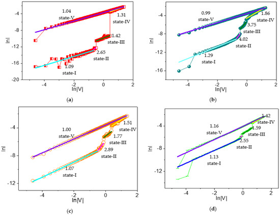To understand the current conduction mechanism in dextran-based biomemristors, reverse biased I–V curves were plotted on a logarithmic scale (Figure 12). Moreover, the slopes of different regions were calculated and depicted. The scaling exponent parameter α could be extracted from the slope of the linearly fitted log–log I–V plots. In the linear fitting curves of the log–log I–V for ITO/B1/Ni, state I with a slope of −1.09 suggested an Ohmic-like conduction, while state II with a slope of 2.65 revealed a trap-free current conduction at higher voltages under HRS. In contrast, state III (slope = 1.42) showed Ohmic-like conduction under IRS. After that, state IV (slope = 1.31) showed Ohmic-like current conduction at higher voltages. During LRS, state V (slope = 1.04) showed Ohmic-like conduction.