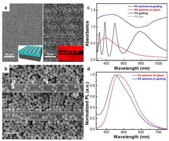 (a,b) SEM images of different magnification depicting Nile-red-dyed PS spheres (R4) in periodic PS grooves of a width of 2.5 µm and a depth of 2 µm. While the inset on the left schematically depicts the expected sphere-in-grating assembly, the inset on the right represents a fluorescence image of the obtained assembly. (c) Absorption spectra comparing an unpatterned PS film both with a PS grating before and after filling with R4 spheres, and with R4 spheres spin-cast on glass. (d) Normalized PL spectra exhibiting a blueshift from 583 nm to 575 nm when comparing R4 spheres spin-cast on glass to those incorporated in the grating. An excitation wavelength of 400 nm was used to record the PL spectra.