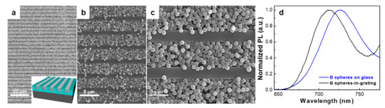 In order to further explore the tunability of the optoelectronic properties characterizing the spheres-in-grating assemblies, we replaced the R4 spheres with blue-dyed PS spheres (B) of a similar diameter (0.49 µm). SEM images emphasizing the resulting assembly and its schematic structure are shown in Figure 2a–c. Again, the uniform and efficient filling over large-area samples was reconfirmed. In this case, B spheres also appeared rather disordered within the top two layers—an effect of post-CSA drying when the remaining water evaporates. Moreover, the emission spectra display an even stronger blueshift from 725 nm to 710 nm when comparing B spheres spin-cast on a glass substrate with those incorporated in the grating (Figure 2c). As stated above, the most plausible origin of the blueshift is related to the arrangement of fluorescent spheres into quasi-ordered structures within the confined grating.