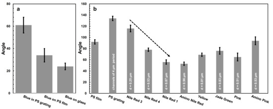 (a) Comparison of the contact angle displayed by surfaces fabricated by spin-casting the blue-dyed B spheres on a glass substrate and on a PS-covered glass substrate, and by their incorporation into a PS grating. (b) Contact angles measured for spheres of different diameter and fluorescent function incorporated into PS gratings, as compared to the contact angles of PS-covered glass and an empty PS grating.