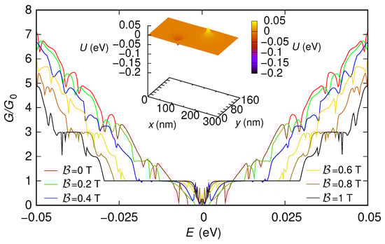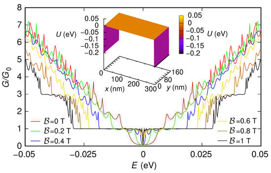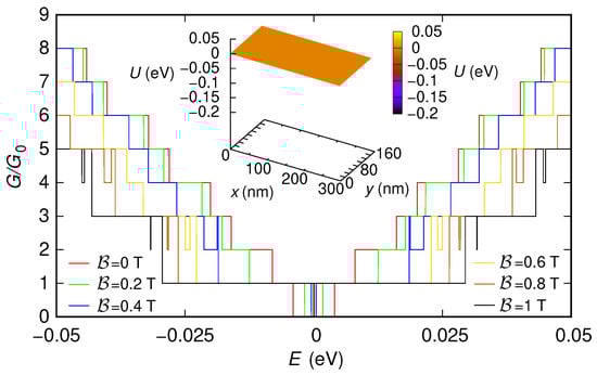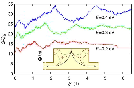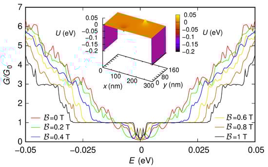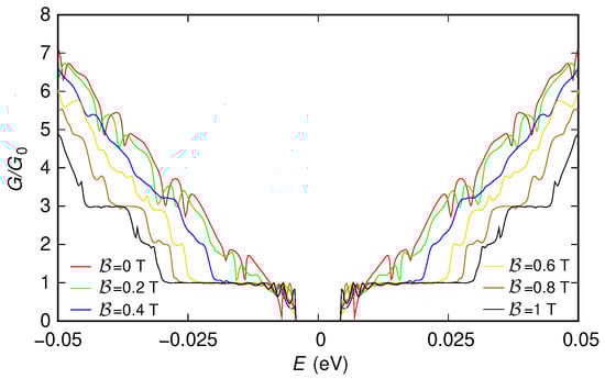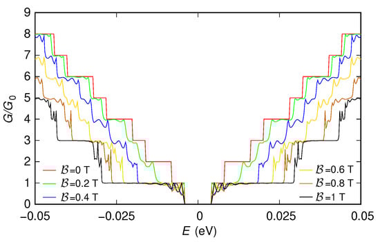 - Peres, N.M.R.; Castro Neto, A.H.; Guinea, F. Conductance quantization in mesoscopic graphene. Phys. Rev. B 2006, 73, 195411. [Google Scholar] [CrossRef]