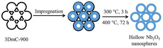 - The dried solid powder was calcined at 300 °C under a nitrogen atmosphere for 3 h to convert niobium pentachloride into niobium oxide and then calcined at 400 °C under an air atmosphere for 72 h to remove the carbon template. Finally, the hollow niobium oxide nanospheres were obtained.