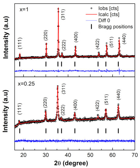 XRD powder pattern and Rietveld refinement of the ferrites with x = 0.25 as a representative sample. The experimental data are represented by black circles, the calculated data by a red line, and the difference between the two by a blue line. Bragg positions are represented by black vertical bars.